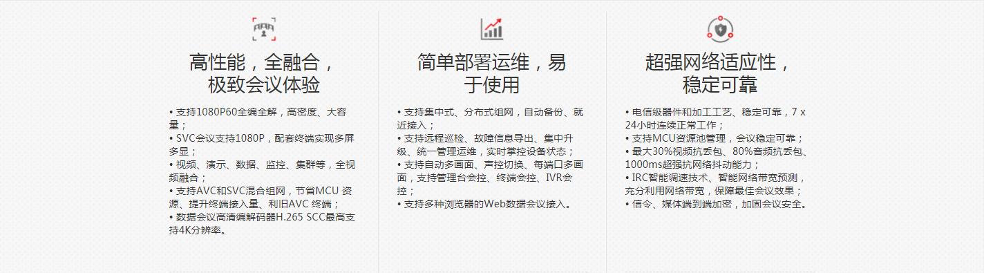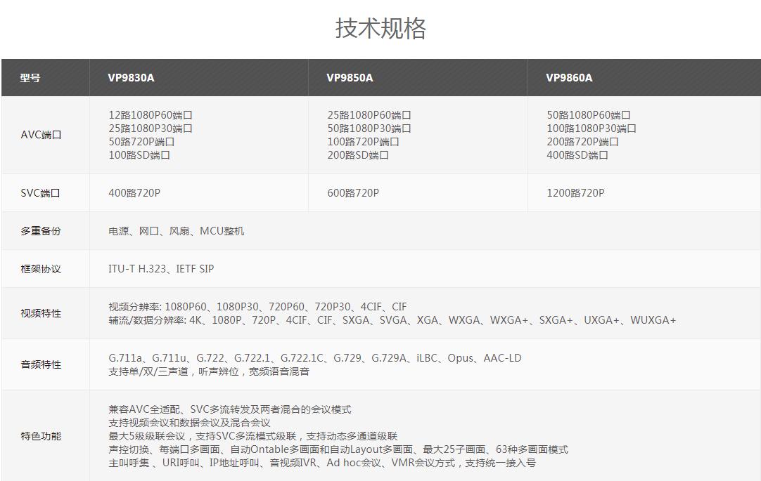 华为VP9800A系列MCU是新一代大容量、可灵活分配端口、平滑扩容的全融合媒体引擎,具备领先的1080P60全编全解超强处理能力,1080P超强多流转发能力,采用新一代高清编解码器H.265 SCC实现高达4K分辨率的数据会议,天然融合视频、音频、辅流、数据,提供无缝的沟通协作能力。