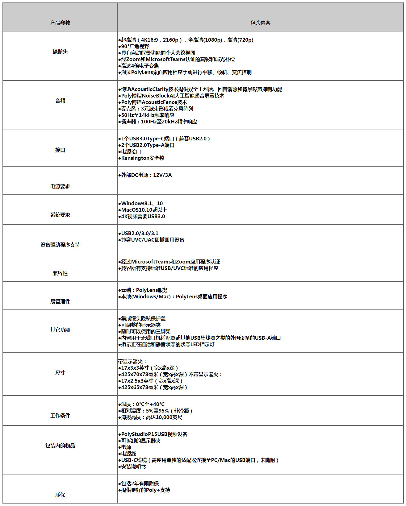 • 4K 分辨率, 可确保获得无比清晰的图像 • 高性能图像传感器 • 集成镜头隐私保护盖 • 强大的集成扬声器 • 多麦克风阵列 |