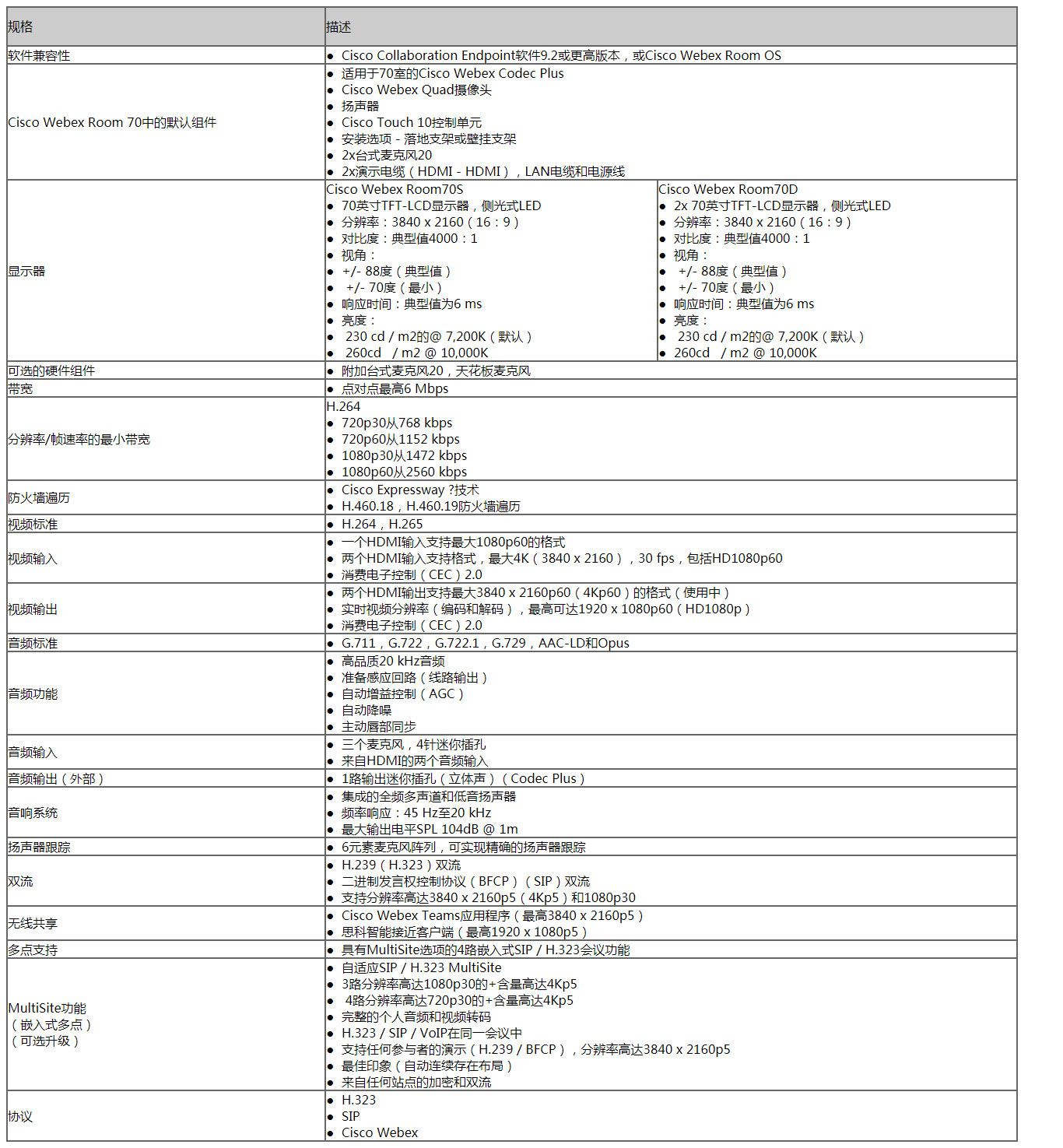 思科CS-ROOM70-K9通过一体化解决方案将美观设计和强大功能融合在一起,非常适合大中型会议室使用。无论要组织世界各地团队参与的会议,还是组织本地会议,Cisco Room70 都能帮助您把会议空间转化为一个强大的视频协作中心。